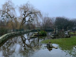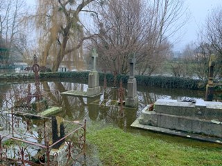 Rien de particulièrement notable dans le cimetière de Ponts, dans la périphérie d’Avranches -il fut un des anciens cimetières paroissiaux d’Avranches- , collé contre l’église Saint-Etienne ; si ce n’est qu’en ce mois de février, la Sée est encore hors de son lit et inonde la petite nécropole, qui a conservé son caractère ancien. Le fait n’est pas nouveau : des témoignages issus des registres paroissiaux au XVIIIe siècle en faisaient déjà état !