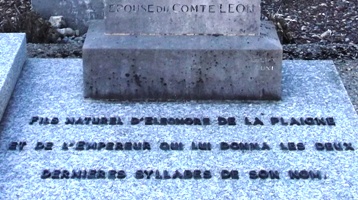 Si la tombe du comte Léon a disparu, il n’en est pas de même de celle de son épouse, qui repose dans le village de Vitz-sur-Authie, dans la Somme. Selon Bertrand Beyern, ses restes furent déposés dans ce caveau par une journaliste du Figaro, Mlle Lédé (+1982), qui repose également dans ce tombeau, dont l’épitaphe proclame "Ici, repose la Comtesse Léon, belle fille de Napoléon 1er, décédée à Villeroy le 12 mars 1899, épouse du comte Léon… Fils naturel d’Eléonore de la Plaigne et de l’Empereur qui lui donna les deux dernères syllabes de son nom" (la fin de l’épitaphe étant devenue illisible sur le socle de la croix, il fut ultérieurement réécrit sur la dalle moderne).