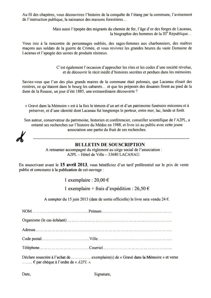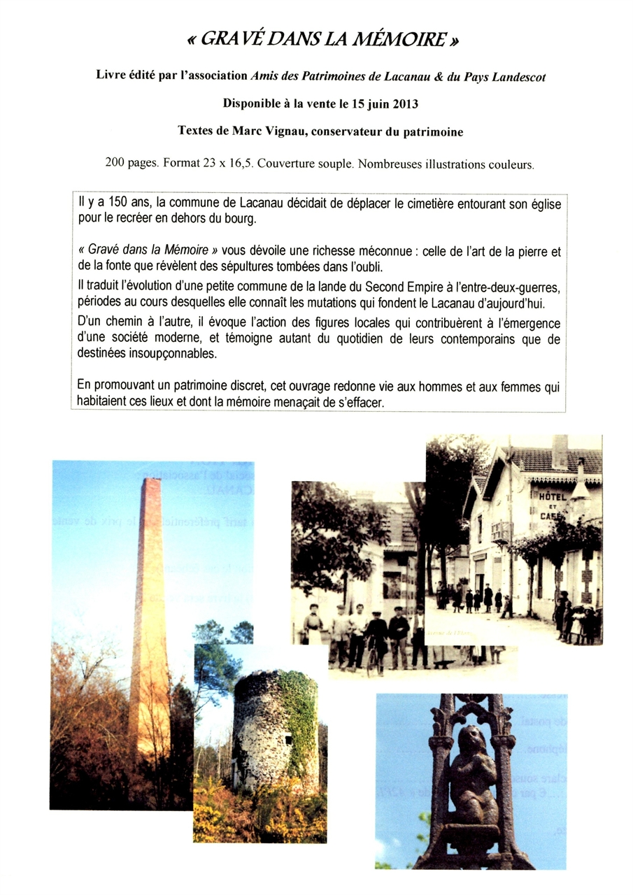 Ainsi que prévu, sa parution officielle a eu lieu le samedi 15 juin, au cours d’une manifestation qui a connu beaucoup de succès. La connexion entre patrimoine funéraire et histoire locale, sur laquelle nous avons délibérément appuyé dans le sous-titre (Lacanau du Second Empire à la Grande Guerre), a beaucoup joué pour amener le public vers ce sujet injustement délaissé, voire rejeté.
