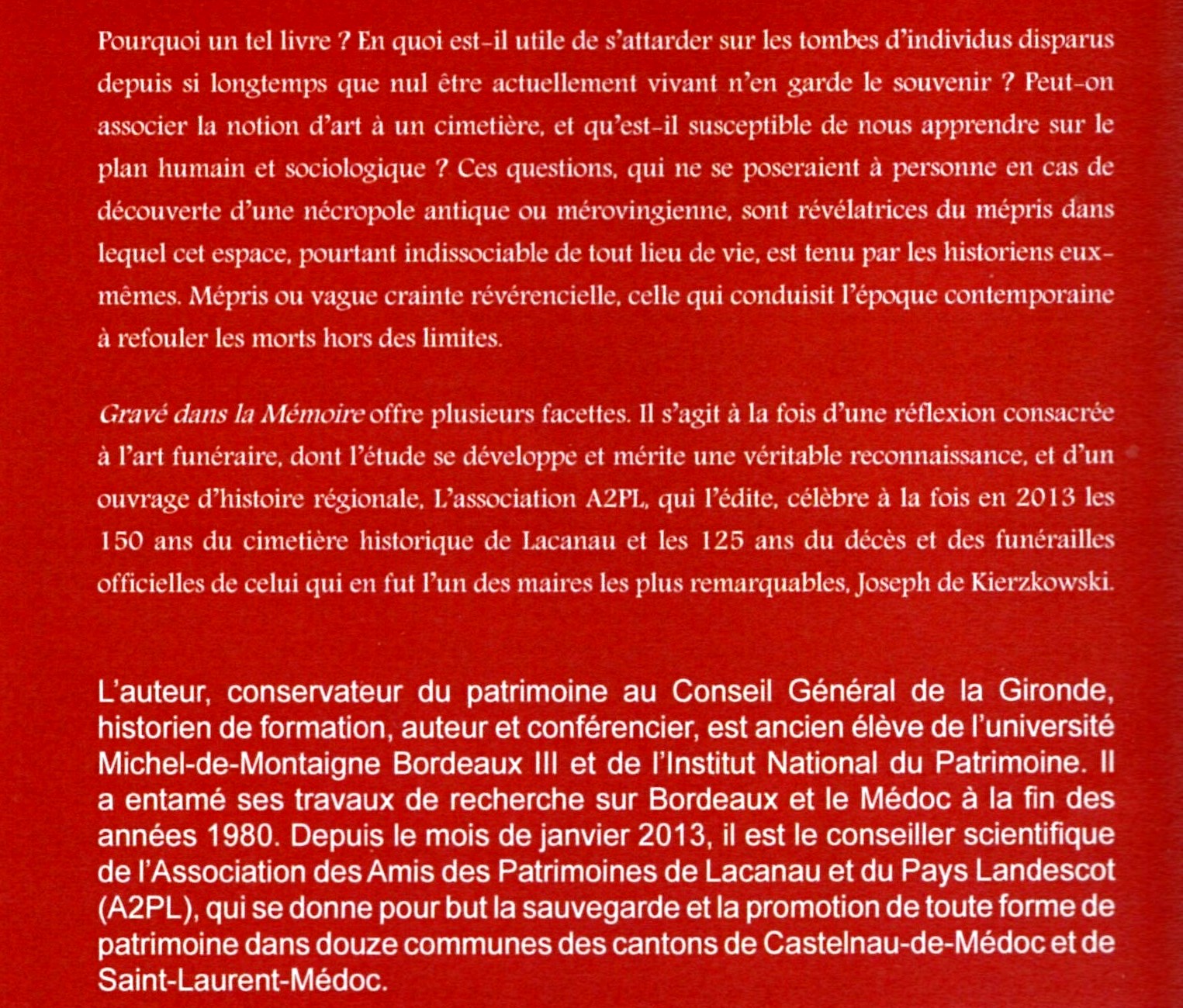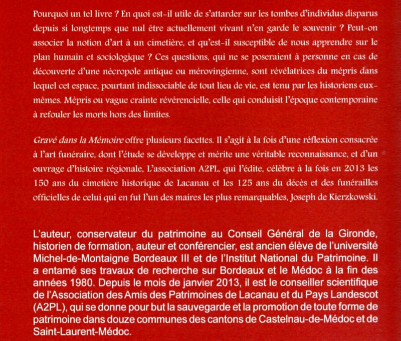 C’est avec plaisir que je fais aujourd’hui la promotion d’un ouvrage à venir sur le patrimoine, en particulier funéraire, de cette région. Je donne la parole conservateur du patrimoine de Gironde : Il s’agit d’un ouvrage consacré à l’histoire de la ville de Lacanau à travers son cimetière historique, à paraître le 15 juin prochain.