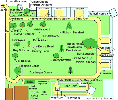 Un très grand nombre de célébrités sont inhumées ici. Beaucoup d’entre elles sont connues du fait de la diffusion sur nos antennes de séries américaines, parfois anciennes. Une autre caractéristique de ce cimetière : le nombre important de jeunes actrices mortes prématurément, souvent tragiquement.