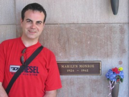 choisi parce qu’il n’était pas connu : Marilyn MONROE (Norma Jeane Mortensen -et pas Baker- : 1926-1962). Nous ne reviendrons pas sur les multiples hypothèses sur son décès. Dès sa mort, sa tombe (une case de la crypte située au nord du cimetière) devint un lieu de culte pour ses fans et cela n’a jamais cessé depuis. Son ancien mari, le joueur de baseball Joe di Maggio, fit fleurir sa tombe tous les jours d’une rose jusqu’à son propre décès. On sait que le milliardaire Hugh Hefner, le fondateur du magazine Playboy, s’est acheté pour une somme colossale l’emplacement vide situé directement à la gauche de celui de Marylin. La plaque -et ses environs immédiats- sont régulièrement maculés de message de ses fans.