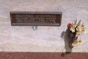 table d’opération. Elle est connue pour avoir été, à trois reprises, l’héroïne d’un film culte dans son genre : Poltergeist. A noter que celle qui jouait sa grande soeur dans le film, Dominique DUNNE (1959-1982), fut étranglée par son petit-ami et qu’elle repose également dans ce cimetière.