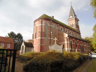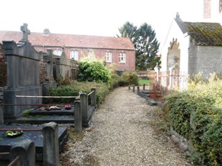 Contre l’église Saint-Vaast, le vieux cimetière entremêle vieilles tombes et buis invasifs. C’est là que se trouve la tombe d’Elisa Dujardin, dont l’identité sur la tombe familiale est devenue quasiment illisible.