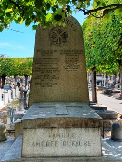 – Amédée DUFAURE (1851-1915) qui occupa des fonctions diplomatiques avant de devenir, de 1889 à 1893, un député conservateur de la Seine-et-Oise. Il était le fils de l’ancien président du Conseil et académicien français Jules Dufaure. Dans ce même tombeau repose Alix DUFAURE-BENICHOU (1935-2012), journaliste de mode qui travailla pour le magazine féminin Marie Claire. D’un premier mariage, elle eut deux enfants dont l’acteur Vincent Lindon. Elle épousa ensuite Pierre Bénichou.