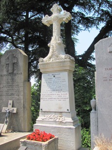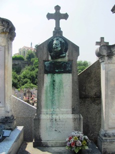 On cherchera en vain, fort malheureusement, la sépulture du père de Guignol, le marionnettiste Laurent MOURGUET (1769-1844). Même si c’est à la ville de Lyon que ce dernier est irrémédiablement attaché, c’est bien à Vienne que mourut le créateur de la célèbre marionnette, mais également de son épouse Madelon et de son indissociable Gnafron. L’actuel cimetière n’existait pas encore : les sources sont muettes mais il semble qu’il ait été inhumé dans un cimetière paroissial dans le bas de la ville, désormais disparu. Reste ici son souvenir. Ses descendants, mais également d’autres célèbres marionnettistes qui reprirent sa suite au Théâtre de Guignol, sont inhumés au cimetière de Brindas (69).