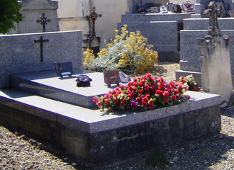 Il repose, oublié, avec sa mère et sa servante dans ce petit cimetière accolé a l’église blanche, sur les hauteurs de Brassac entouré de magnifiques cèdres et de champs de tournesols selon les saisons