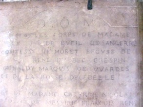 seigneur de Courcillon et de La Marchère, qui fut l’une des maîtresses officielles du roi Henri IV. Il ne lui était pas fidèle, mais elle lui rendit bien ! Le roi la fit comtesse de Moret : de leur liaison naquit en 1607 un enfant prénommé Antoine de Bourbon-Bueil. Le petit comte de Moret fut légitimé en mars 1608. Elle épousa ultérieurement le marquis de Vardes, et leur descendance repose sous ce caveau.
