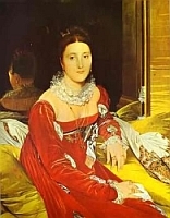 Tout comme Caroline Rivière, ce n’est que grâce au portrait qu’Ingres en a laissé, que Madame de Senonnes n’est pas totalement oubliée, du moins par les amateurs d’art. A l’époque de sa vie où Ingres dédaignait le portrait, il est curieux de constater le soin apporté à cette peinture, achevée en 1814. Encore un fois, ce portrait est porteur d’une grande sensualité : les lèvres sont entrouvertes, le décolleté est révélé par une chemise transparente, la robe de velours rouge doublée de satin est un hommage à la Fornarina, autre femme perdue... Voilà Mme de Senonnes prête à aller au bal, parée comme une châsse, portant pas moins de treize bagues et quatre chaînes en or qui retiennent autant de pendentifs. La robe rouge tranche sur le sofa de soie jaune sur lequel elle est assise. Nous avons encore une fois à faire à un « monstre » ingresque, le bras droit de la dame étant totalement disproportionné : il fait ici écho au châle de cachemire qui semble avoir glissé des épaules. En y regardant bien, on devine ici l’écho de la Grande Odalisque qu’Ingres peint la même année.