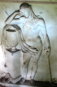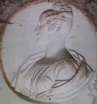 Native de Lyon, et épouse d’un drapier lyonnais c’est avec ce dernier qu’elle vient s’établir à Rome où le couple ne tarde pas à divorcer. Se faisant passer pour italienne, elle devient la maîtresse d’Alexandre de la Motte-Baracé (1781-1840), vicomte de Senonnes, collectionneur, artiste à ses heures et royaliste convaincu qui doit attendre la chute de l’Empire pour rentrer en France [1]. Leur mariage a lieu à Paris en août 1815, au grand déplaisir de la famille de l’époux. La vicomtesse meurt dans la capitale le 25 avril 1828. Elle repose en bordure de 45ème division dans une chapelle très délabrée. Il faut pousser la porte pour y lire les noms des personnes inhumées et apercevoir un joli médaillon représentant Marie de profil ainsi qu’un bas-relief représentant un jeune éphèbe nonchalamment appuyé sur une urne et tenant une torche renversée, par Louis-Marie Normand.