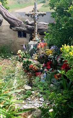 La tombe est fleurie, et recouverte de colifichets à caractère religieux.