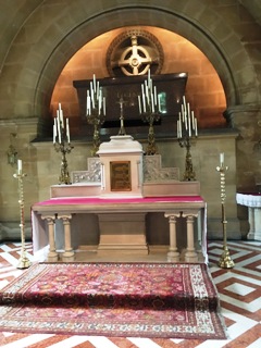 En 1873, à la mort de l’empereur, on déposa son corps dans une chapelle de la petite église catholique Sainte-Mary de Chislehurst, ville du Kent où la famille impériale déchue avait élu domicile. Lorsqu’en 1879 le Prince impérial dut rejoindre son père, on ne put que le placer dans un mur de la chapelle. C’est à ce moment qu’Eugénie décida de leur faire bâtir un tombeau plus imposant. L’église abbatiale a été construite dans le style gothique flamboyant par l’architecte français Gabriel-Hippolyte Destailleur. Il est intéressant de noter qu’elle est ornée de deux tableaux provenant des Tuileries (ils ont un tel besoin de restauration qu’on pourrait croire qu’ils ont connus l’incendie de 1871, ce qui n’est évidemment pas le cas !). Cette chapelle sert d’écrin à la crypte, où repose la famille impériale.