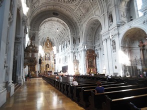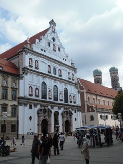 Large édifice religieux de style Renaissance finissant, en plein coeur de la ville, elle résulte de la volonté de l’électeur Guillaume V de relever le catholicisme dans ses Etats suite à la Réforme. L’impressionnante façade combine des éléments structurellement baroques dans son triple niveau surmonté d’un fronton et soutenus de discrets piliers (plutôt que de colonnes). La décoration cependant, marque nettement un début de classicisme dans sa recherche de lignes symétriques et son maniérisme. Si, entre les deux portes d’entrée se trouve la statue traditionnelle de l’archange saint Michel tuant l’ennemi de la foi, aux niveaux supérieurs de la façade les niches contiennent des statues des seigneurs de la famille de Bavière et non des saints comme on pourrait s’y attendre.