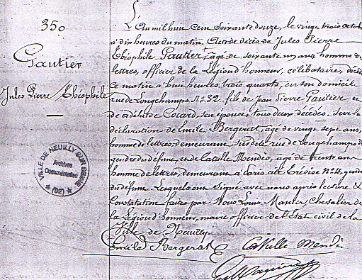 D’une première liaison avec Eugénie Fort, il eut un fils : Théophile GAUTIER fils (1836-1904), qui exerça des fonctions administratives avant de devenir secrétaire particulier de l’ancien ministre de Napoléon III, Eugène Rouher. Il fit des traductions d’auteurs allemands et collabora aux travaux de son père dans le Moniteur et le Journal officiel. Ce dernier et sa descendance reposent au cimetière d’Auteuil à Paris.