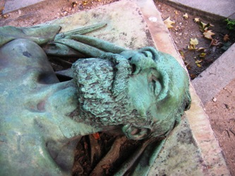 CAVAIGNAC (1801-1845) fut journaliste et devint l’un des leaders du parti républicain après 1830. Il fut l’un des organisateurs de la nuit d’émeutes du 15 avril 1834, raison pour laquelle il fut enfermé à Sainte-Pélagie d’où il s’échappa. Il eut droit à de funérailles grandioses organisées par ses amis républicains. C’est lui qui est représenté par le gisant très expressif qui recouvre la tombe. Attribué à Rude, qui fut assisté d’Ernest Christophe, il semblerait qu’il faille en attribuer plus justement la paternité au second qu’au premier.