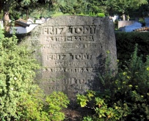 socialiste importante, il fut le fondateur de l’Organisation qui porta son nom, chargée de la réalisation d’un grand nombre de projets de construction, dans les domaines civil et militaire, tant en Allemagne que dans les pays d’Europe sous domination nazie. La plus célèbre d’entre toutes fut le célèbre mur de l’Atlantique, dont témoignent encore aujourd’hui la multitude de bunkers plus ou moins échoués sur nos plages. De 1940 à 1942, il fut nommé ministre du Reich pour l’Armement et les Munitions. Il périt dans un accident d’avion. Une cérémonie mortuaire officielle fut organisée à Berlin, et il fut inhumé à l’Invalidenfriedhof de la ville. Les Alliés en 1945 ordonnèrent de détruire les monuments funéraires des anciens dignitaires du national-socialisme. Celle de Todt le fut, mais sa dépouille est toujours en terre au cimetière des Invalides. Pour lui aussi, cette tombe familiale tient lieu de cénotaphe.