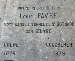 travaux publics, des chemins de fer en particulier, à qui l’on doit entre autres le premier tunnel ferroviaire du Saint-Gothard. Très vite, des problèmes techniques imprévisibles, car liés à la mauvaise évaluation par la Compagnie du chemin de fer du Gothard, des force motrices (débits d’eau) disponibles et à la nature géologique des roches, ralentirent les travaux. Sept mois avant le percement du dernier tronçon, le 19 juillet 1879, Favre mourut dans la galerie du tunnel.