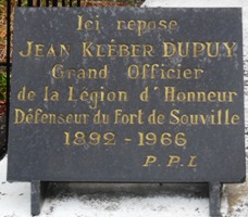 repose Kléber DUPUY (1882-1966). Instituteur, il fut envoyé sur le front en 1915. Après la chute des forts de Douaumont et de Vaux, le fort de Souville était le dernier rempart avant la ville de Verdun située à 3,8 km de distance. Le 11 juillet 1916, la compagnie à laquelle appartenait Kléber Dupuy reçut l’ordre de renforcer les troupes des carrières de Vaux-Chapitre. Il fit le choix de prendre la défense du fort de Souville : « Ici tout est bouleversé. Le commandant du fort est intoxiqué, la garnison est hors de combat. Sauf ordre contraire, je reste au fort et j’en assume la défense. » permettant ainsi de préserver le fort, et de couper définitivement la progression allemande sur Verdun.