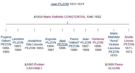 1) Pierre PEZON (1825-1895), l’aîné, demeura à Rimeize où il fut agriculteur. Il y mourut ainsi que sa descendance. A voir lors d’un prochain voyage si je peux trouver trace des tombeaux de cette branche en Lozère.