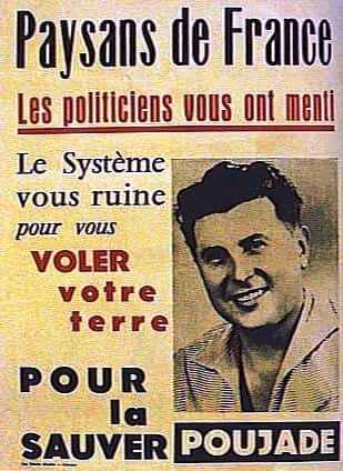 Nationaliste vichyste (un père sympathisant maurrassien, ancien militant de l’Union populaire des jeunesses françaises, filiale du PPF de Jacques Doriot, avant de devenir, durant la guerre, chef de compagnie d’un mouvement de jeunesse vichyste), il accéda brutalement à la notoriété en 1953 lorsqu’il prit la tête d’un groupe de commerçants qui s’opposaient de manière musclée à un contrôle fiscal. Excellent orateur de tribune, Pierre Poujade parla à toutes les professions qui se sentaient menacées par un monde qui changeait. Au nom des « petits », il dénonça avec véhémence « l’État vampire » et ses « soupiers » (les grands commis qui « vont à la soupe »), les « éminences » et les « apatrides » qui occupaient la « maison France ». Son mouvement était violemment antiparlementaire qui condamnait l’inefficacité du parlementarisme tel qu’il était pratiqué dans la IVe République. Son mouvement syndical, l’Union de défense des