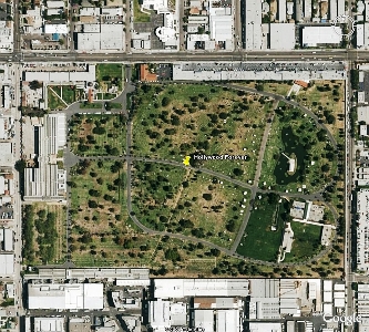 Le cimetière se présente donc sous la forme d’un vaste espace vert arboré sur lequel on trouve un lac artificiel. On y pénètre par le boulevard Santa Monica.