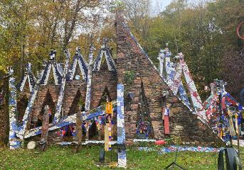 Peintre, graveur et architecte, déjà connu comme céramiste, Jean LINARD (1931-2010) remodela sa maison plusieurs fois, créant de nouvelles pièces, transformant et refaisant les toitures qu’il agrémenta de tuiles de couleur et de tuiles-personnages de sa fabrication, décorant les cheminées, le tour des portes et des fenêtres de mosaïques aux couleurs éclatantes. Il entreprit à partir de 1983 son œuvre majeure, la Cathédrale, construction monumentale, à la fois architecturale et sculpturale, inclassable et rangée sous le vocable d’environnement visionnaire. Construite en plein air dans un esprit résolument œcuménique les noms de Jésus, Mahomet, Bouddha, Bahá’u’lláh, Gandhi, Martin Luther King, Sœur Emmanuelle, Mère Teresa, Picassiette, Gaudí, Picasso et autres personnages que Jean Linard affectionnait particulièrement sont gravés sur la mosaïque. Un chemin de croix s’y termine avec une croix de résurrection aux couleurs éclatantes.