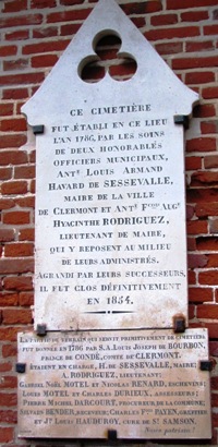Une plaque sur le mur du cimetière rappelle que le cimetière date de 1786, établi sur un terrain don du prince de Condé Louis-Joseph de Bourbon.