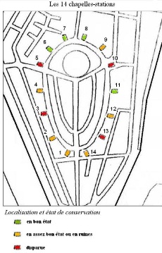 Ce cimetière possède une particularité rare : la présence initiale, organisée en mandorle autour du calvaire, de quatorze chapelles, représentant les quatorze stations du chemin de Croix. Aujourd’hui nombre d’entre elles sont à l’abandon, en état de ruines voire disparues.