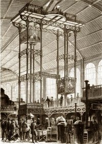 élévateur hydraulique qu’il baptisa « ascenseur » ! Ami de Gustave Eiffel, installé à Paris en tant qu’entrepreneur en travaux publics, c’est l’observation des premiers grands chantiers haussmanniens qui le conduisit à imaginer un monte-fardeaux hydraulique, dont il déposa le brevet le 4 juin 1864. Son invention fut présentée à l’Exposition universelle de Paris en 1867, dans la galerie des machines. En 1884, Eiffel commanda à Edoux l’ascenseur qui devait relier le deuxième étage au
