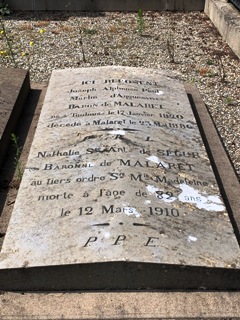 – (2) Louis Napoléon de MALARET (1856-1888), frère de Camille et Madeleine. Filleul de Napoléon III et de l’Impératrice Eugénie, sa Grand-mère lui dédicaca, à lui et à son frère, L’auberge de l’ange gardien. Il repose avec son neveu, Paul de MALARET (1891-1919), fils de son frère Gaston [1]. Mort à 27 ans, il se maria néanmoins et eut une descendance qui existe encore aujourd’hui.