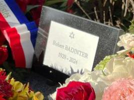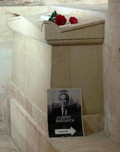 Inhumé au cimetière parisien de Bagneux, sa panthéonisation fut rapidement décidée. Il entra symboliquement au Panthéon le 9 octobre 2025, date coïncidant avec le 44e anniversaire de l’abolition de la peine de mort en France. Ses restes ne furent transférés dans la nécropole républicaine et demeura à Bagneux : un cénotaphe fut érigé, contenant sa robe d’avocat et trois livres : Idiss, que Robert Badinter avait écrit en hommage à sa grand-mère, Choses vues, de Victor Hugo, et enfin, une biographie de Nicolas de Condorcet, député du XVIIIe siècle, qu’il écrivit avec son épouse. Ce cénotaphe se trouve dans le caveau VII des révolutionnaires de 1789, où se trouve également celui de Nicolas de Condorcet. Sa tombe à Bagneux fut profanée le jour de la panthéonisation.