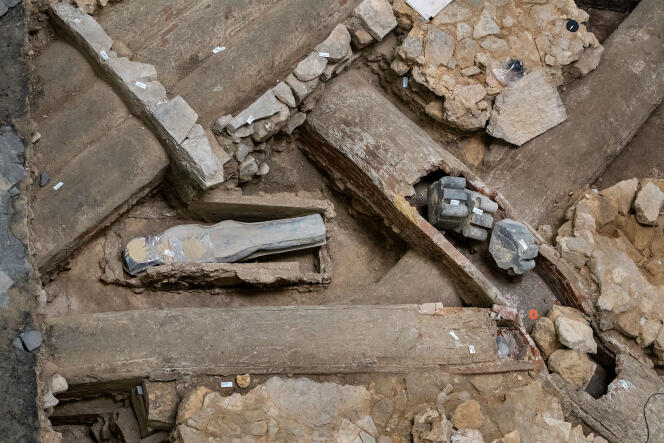 Eric Crubézy et son équipe y sont arrivés au terme d’une véritable enquête rétrospective. Début 2022, la croisée du transept avait été fouillée avant la pose du fameux échafaudage de 700 tonnes qui allait permettre la reconstruction de la flèche. Huit sépultures y avaient été découvertes. Rien d’étonnant : des milliers de personnes, essentiellement des hommes d’Eglise, ont été enterrées entre le XIVe et le XVIIIe siècle dans ce qui constituait alors une nécropole.