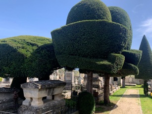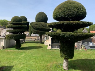 Ce cimetière se signale par son jardin d’ifs taillés en topiaires, pratique attestée depuis 1906. Les arbres, taillés impeccablement, donne au cimetière des allures de décor à un insolite pays des merveilles d’Alice !