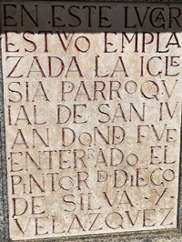 A proximité du Palais royal, la place de Ramales est aujourd’hui un espace accueillant ponctué de terrasses de cafés. Au centre, assez discrète au point qu’on puisse l’ignorer, figure une colonne montée sur un piédestal. Elle se trouvait originellement devant l’église San Juan Bautista, qui se trouvait à cet emplacement, et où fut inhumé le peintre baroque Diego VELÁZQUEZ (1599-1660).