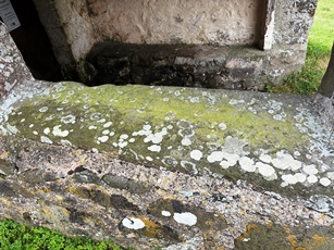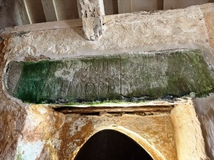 En entrant dans l’église, sur l’étagère et le linteau du mur est du porche, se trouvent deux dalles transversales datant du XIVe siècle. Les deux pierres sont sculptées de croix, mais la dalle inférieure porte également l’image d’un navire (bon : il faut une bonne vue et un peu d’imagination !).