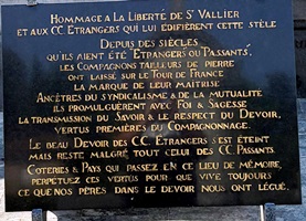 – A l’initiative d’un Compagnon Passant tailleur de pierre, une plaque a été posée en 2000 en hommage à Joseph Robert, dit "La Liberté de Saint-Vallier", compagnon Étranger tailleur de pierre (1799-1873). Sa société, qui était encore active à cette date, l’avait honoré d’une stèle ornée du blason du Devoir Étranger et deux cannes entrecroisées.
