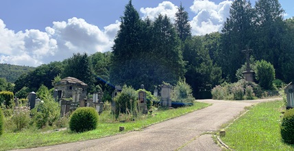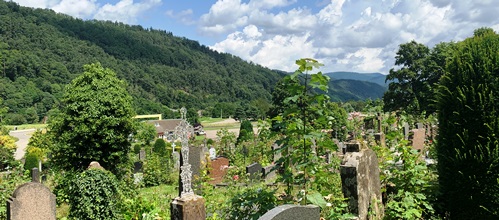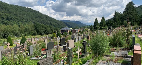 Au cimetière Saint-Guillaume se distingue une partie protestante, où les vieilles stèles sont disséminées dans une végétation luxuriante ; d’une partie catholique, en contrebas, moins arborée. C’est un très beau lieu, offrant de belle vue sur les Vosges, propice à la promenade et au caractère éminemment romantique, dans le sens que l’on donne à ce mot quand on traité des cimetières.