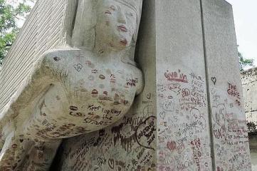 Il fut dans les années 90 victime d’une overdose de rouge à lèvres : les visiteurs, pas tous admirateurs mais tous amateurs de la pratique, avaient pris l’habitude de déposer un baiser sur sa sépulture. Résultat : la matière grasse déposée endommagea sévèrement la pierre et laissa des traces indélébiles. Chaque débarbouillage usait la pierre et la rendait plus poreuse.