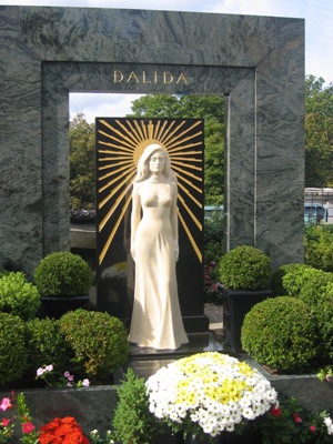 Sa tombe est facilement trouvable en bordure de division (dans la partie haute du cimetière). Après des obsèques en l’église de la Madeleine, Dalida y fut conduite. Sa tombe monumentale est de Alain Aslan (sculpteur prolifique qui fut également à l’origine de plusieurs Marianne, dont celle de Brigitte Bardot). L’artiste est représentée grandeur nature devant un soleil qui semble irradier d’elle. Son visage est triste, à l’image du destin de celle qui se donna la mort dans sa maison, proche du cimetière, puisque Dalida vivait rue d’Orchampt, à Montmartre. Une place porte désormais son nom à quelques encablures.