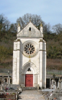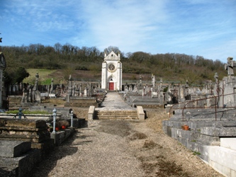 Le petit cimetière de Corvol-l’Orgueilleux présente des allées tracées au cordeau qui ne sont pas exemptes de vieilles tombes de notables locaux, et qui montent en une pente douce vers une immense chapelle qui tranche par sa monumentalité.
