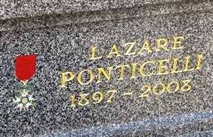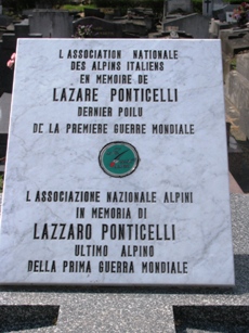 Symboliquement également, Lazare Ponticelli fit un triple pied-de-nez à l’histoire : aux nationalistes nostalgiques, il tint jusqu’à la fin, avec beaucoup de lucidité, un discours très critique vis-à-vis de la guerre. Aux tenants d’une "identité nationale" frelatée, notre dernier poilu français opposa... sa nationalité italienne d’origine ! Enfin, aux pompes si mal adaptées de la République (et à la récupération politique qui en aurait sans doute été faite), sa famille a eut le bon goût de préferer, à la froideur du Panthéon, l’inhumation auprès des siens (en particulier ses frères et soeurs). Une plaque sur sa tombe est un hommage des Alpini, corps dans lequel il combattit en Italie.