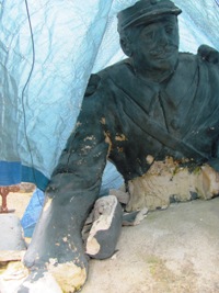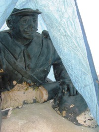 Malheureusement, lors de ma visite en mars 2013, force fut de constater le très mauvais état de cet ensemble. Sans preuve, je pense que c’est bien le temps (dans les deux sens du terme) qui fut à l’origine de cette dégradation. A ma venue, une disgracieuse bâche recouvrait l’ensemble. Il y a là, à l’évidence, un besoin urgent de rénovation. J’ignore si la commune, l’armée, ou une association se sont emparés du dossier !