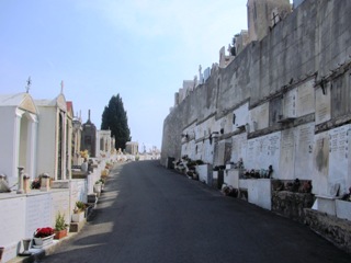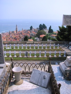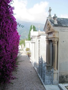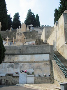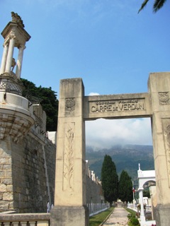 Un dédale toujours ascendant de coursives, de terrasses, d’escaliers, de numéros de divisions incohérents ; l’absence de tout personnel pour me guider ; la fatigue d’une journée dans les pattes et, en particulier quelques temps avant, la visite du cimetière du vieux château ; le soleil de juillet enfin, toujours implacable sur les dalles blanches : bref, tout cela pour expliquer que très exceptionnellement, le cimetière du Trabuquet a eu raison de moi, et que ma visite n’a été que très superficielle. C’est rare, car même s’il m’arrive de me décourager à l’arrivée devant l’ampleur de la tâche, la passion et la curiosité finissent toujours par l’emporter (c’est particulièrement vrai pour un cimetière si éloigné de Paris, avec en plus des personnalités qui m’intéressent).