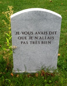 - la stèle portant pour épitaphe Je vous avais dit que je n’allais pas très bien de Gianni Motti. Rappelons à cette occasion que cette épitaphe était une boutade à l’origine, et Internet fait circuler depuis plusieurs années un grand nombre de photos trafiquées dans lesquelles elle apparaissait. Cependant, le succès du message fut tel que désormais, on trouve des tombes qui la portent vraiment aux Etats-Unis !