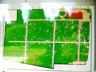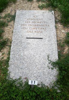 - La concession de la pseudo-tombe créée par Sophie Calle, allouée pour 20 ans, est une dalle posée à plat à même l’herbe, munie d’une fente au-dessus de laquelle figurent ces mots, gravés dans la pierre en lettres d’or ? : « Ici reposent les secrets des promeneurs du cimetière des Rois. » Elle invite les visiteurs à glisser leurs secrets dans la fente de la pierre comme ils le feraient dans une boîte aux lettres promise à l’oubli éternel.