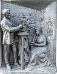Il repose sous un très beau tombeau réalisé par l’architecte Paul Dusart, orné d’une tête de Christ par Crauk, et d’un bas-relief par Henri Gauquié.