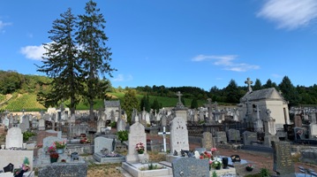 Plan incliné dominé par le vignoble bourguignon, dans une commune devenue périurbaine de Dijon, le cimetière de Chenôve possède quelques tombes qui intéresseront le taphophile.