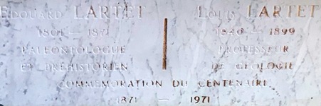 retourna dans sa région natale et mourut le 29 janvier 1871, le jour de l’entrée des troupes de Guillaume Ier dans Paris, avant d’avoir inauguré son enseignement. Avec lui repose son fils Louis LARTET (1840-1899) qui devint également préhistorien. En 1868, il va fouiller le site préhistorique de Cro Magnon, qui vient d’être découvert en Dordogne, à l’occasion de travaux routiers, et dans lequel se trouvent associés, pour la première fois, mobiliers et restes humains. Il est l’inventeur du squelette de l’Homme de Cro-Magnon, représentant fossile de l’Homo sapiens actuel, dans le site de l’abri de Cro-Magnon, aux Eyzies-de-Tayac. Il occupa de 1879 à sa mort la chaire de Géologie et Minéralogie à la Faculté des sciences de Toulouse.