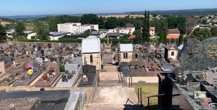 Le cimetière de Xertigny s’étage en paliers : en haut, vue plongeante sur la commune et la campagne.